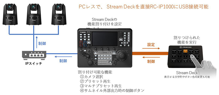 RC-IP1000からStream Deckのキーに「カメラ選択」「プリセット再生」などの機能を直接割り付けることが可能であり、PCレスでシステムを構築することが出来ます。