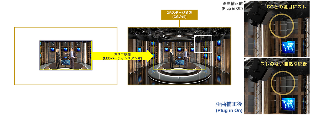 ポストプロダクションでのVFX処理の為のCVメタデータを基に、CG合成前に入力画像の歪曲収差や周辺減光を除去したり、CG合成後に除去した歪曲収差や周辺減光を再度付加する機能を持っています。また合成後の画像に実際にカメラで撮ったようなリアリティを持たせることが可能です。