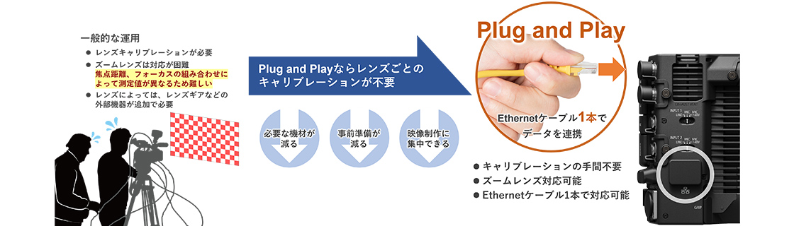 本システムはEthernetケーブル1本でレンズとカメラのメタデータをリアルタイムで出力することができるPlug and Playを実現。