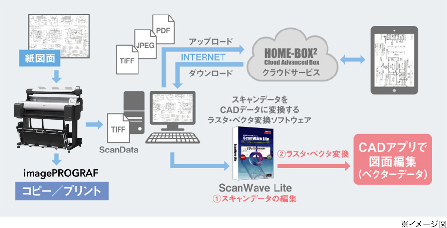 ScanWave Liteがあれば、スキャナーで読み込んだTIFF、JPEG、PDFなどのラスターデータをCADのベクターデータに変換することができます。またスキャンデータの傾き補正、ゴミ除去、指定箇所の除去、ギザギザ線をなめらかにするスムージング機能など豊富な編集機能も備えています。