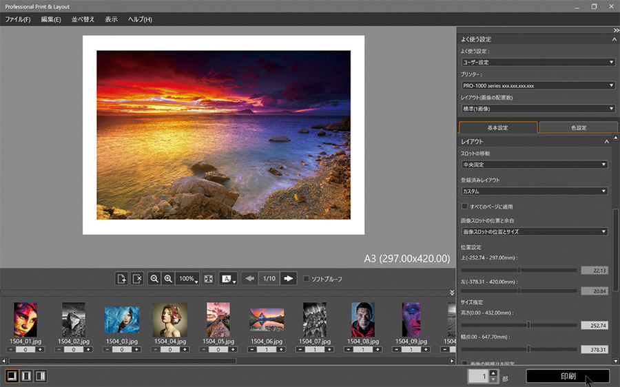 写真の効率的なプリントをサポートする「Professional Print & Layout」。レイアウト設定、プリント前のプレビュー確認、モノクロ色調整などを、見やすい表示で直感的に操作可能。四切りなどよく使う用紙サイズへの変更も簡単に操作できます。