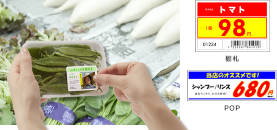 - 写真入りラベルやフルカラーの魅力的なPOPが、お客さまの目と心を捉え、販売促進に貢献します。