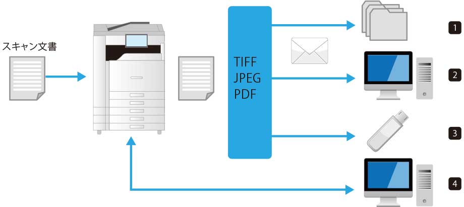 スキャンしたデータ(最大A2)を添付ファイルとして社内のパソコンや社外のモバイル端末に送信できます。