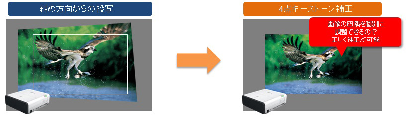 斜め方向から投写した時に生じる画像のズレを、四隅を個別に調整することで緻密に補正します。本体をスクリーン正面に置けない時でも見やすく投写可能です。さらに、被写界深度が深いズームレンズを採用し、映像の隅々までピントを合わせられます。