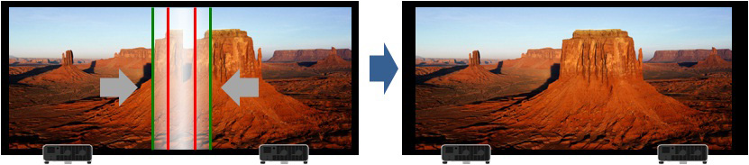 複数のWUX6500を使用して、マルチ投写を行う時に便利な機能がエッジブレンディングです。映像が重なる部分をマーカーで指定するだけで、自動的に輝度差を調整します。つなぎ目がなめらかになり、美しい大画面投写が可能です。