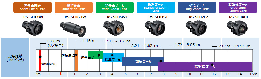 幅広い投写距離に対応するラインアップ。交換レンズ間の輝度変化が少なく、どのレンズでも明るく鮮明に投写可能です。