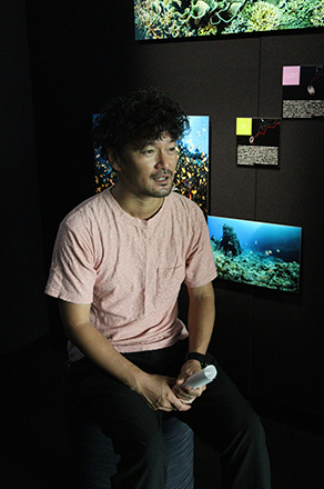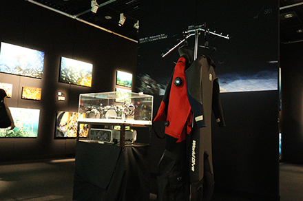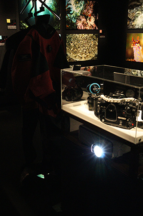 このふたつのルートが合流する会場の中心では、古見氏が使っているカメラやウェットスーツとともに日本の海を撮影した大画面の映像作品が映し出されている。これまでに撮り溜めてきた南北約3000kmに渡る島国・日本の海の写真約130点の中に、プロジェクターを使った映像作品が混ざりこむことで、まるで写真が動き出したかと見まがうような不思議な感覚を感じることができるのは、他ではなかなか味わえない展示方法だ。