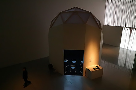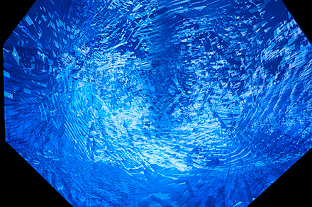 また、複数のプロジェクターを使用して、マルチ投写を行う時に便利な機能(エッジブレンディング)により、自動的に輝度差を調整し、つなぎ目がなめらかになり、視界を覆うドーム型スクリーン一杯に美しい大画面映像とヘッドフォンから流れる音楽により、作品への没入感をより深く味わえる展示となっている。