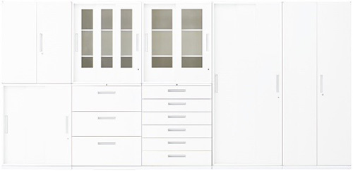 両開きタイプや引き出し(ラテラル)タイプ、高さもハイタイプとロータイプなど、配置する場所や収納物によってさまざまなタイプから選択が可能です。