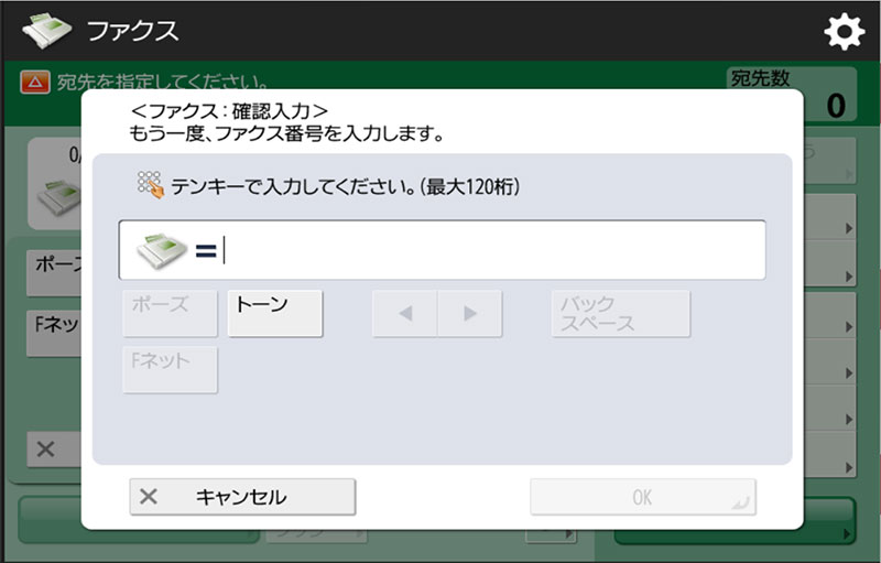 通常はファクス番号を入力してスタートボタンを押すと原稿の読み込みが始まりますが、その前に再度ファクス番号を入力させる画面を表示させることで、ファクス番号誤入力による誤送信を防止できます。