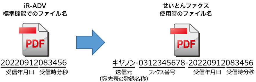 ファクスを電子化した際、予め決められた規則にしたがってファイル名を設定してくれるアプリケーション、それが「せいとんファクス」です。 iR-ADVに「せいとんファクス」をインストールすれば、複合機の宛先表情報をもとに下図のように送信元(宛先表の登録名称)やファクス番号もファイル名に付与することが出来るようになります。