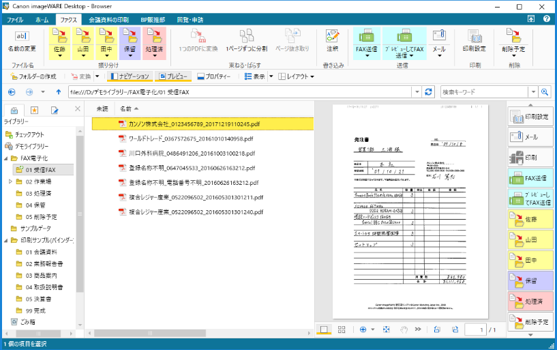 せいとんファクス複合機 imageRUNNER ADVANCEで受信したファクスを電子化し、ファイル名の自動付与と転送先でのフォルダー振り分けを自動で行うアプリケーションです。