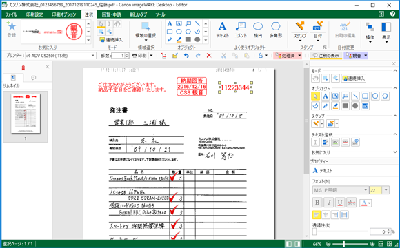 受け取ったファクスに、文字を記入したりはんこを押すことができます。