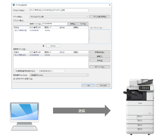 紙を印刷することなく、PCからファクス送信を行えます。複合機に登録してあるアドレス帳を利用できるので、個人ごとにアドレス帳を管理する手間がありません。また、『せいとんファクス』と連携すると、返信先のアドレス帳が自動選択されるので誤送信を防止することができます。
