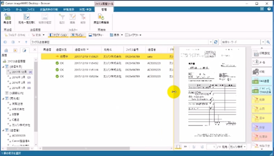 受信ファクスをサーバー等に転送し、『imageWARE Desktop』で確認します。ファクスでの受発注業務に必要な「受信」「閲覧」「書き込み」「返信」「履歴確認」の流れも、席に着いたまま全く紙を使わずに行うことができます。