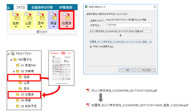 ファイル名に担当者名や処理NO等を追記してファイルを移動することができます。