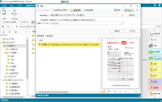 ファイル名に付与された得意先名やファクス番号、処理NOをキーワードとして検索できるので、必要な書類がすぐに見つかります。