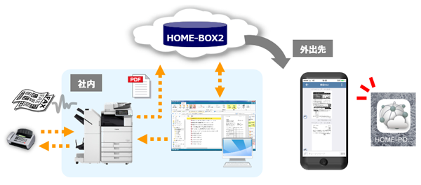 クラウドストレージサービス『HOME』と連携すると、外出先からでも受信したファクスの確認ができるので、対応スピードが向上します。また『HOME type-AP』のスマートフォンアプリを利用すると、ファクス受信がプッシュ通知されるので、簡単な操作でファクスを閲覧できるようになります。