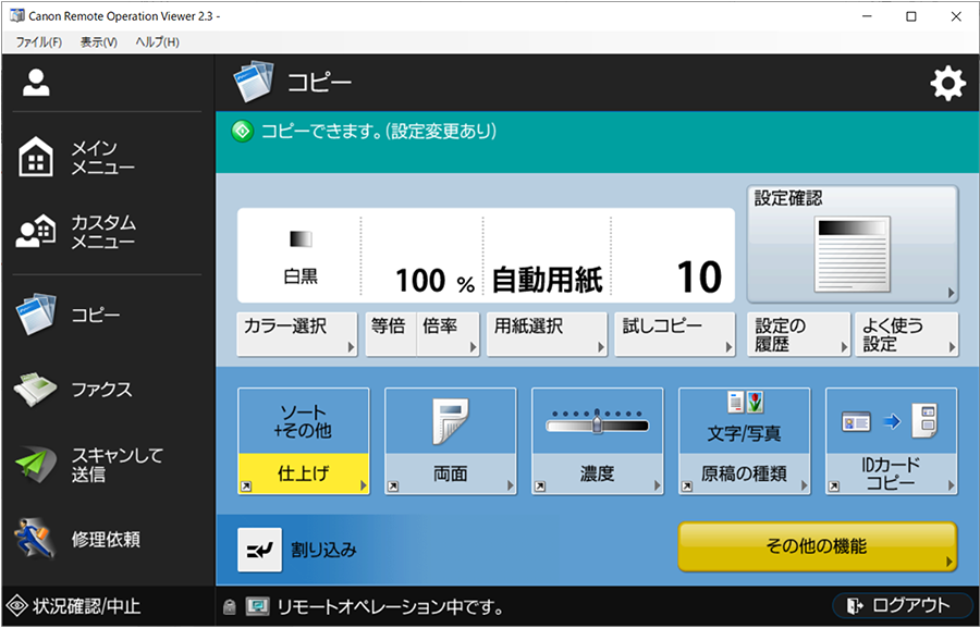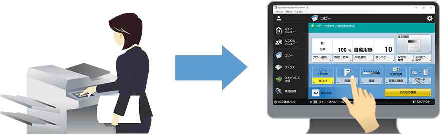 キヤノン製複合機のタッチパネルディスプレーと同様の操作画面をパソコンに表示して、離れた場所からの設定やジョブの実行を可能にするソフトウエアです。
