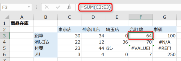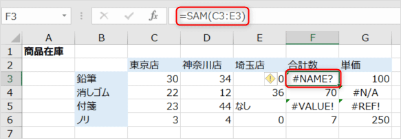 合計値を求める関数【=SUM()】を入力すべきところですが、スペルが誤ってしまっています。