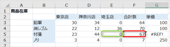 【VLOOKUP関数】で、単価の表を参照しようとしていますが、入力元の商品在庫の表と指定先の単価の表で「消しゴム」の表記方法が異なっています。
