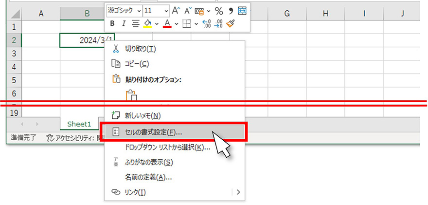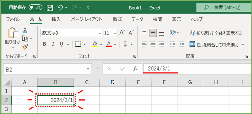 セルの中に日付を入力します。ここでは例として「2024年3月1日」を「2024/3/1」と入力します。