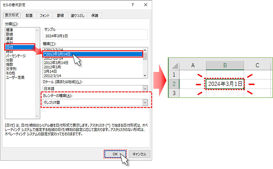 右側の「種類」から日付の書式を選択します。この例では「カレンダーの種類」では「グレゴリオ暦」が選択されているので、グレゴリオ暦の表記になります。