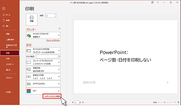 PowerPoint:日付・ページ数を印刷しない