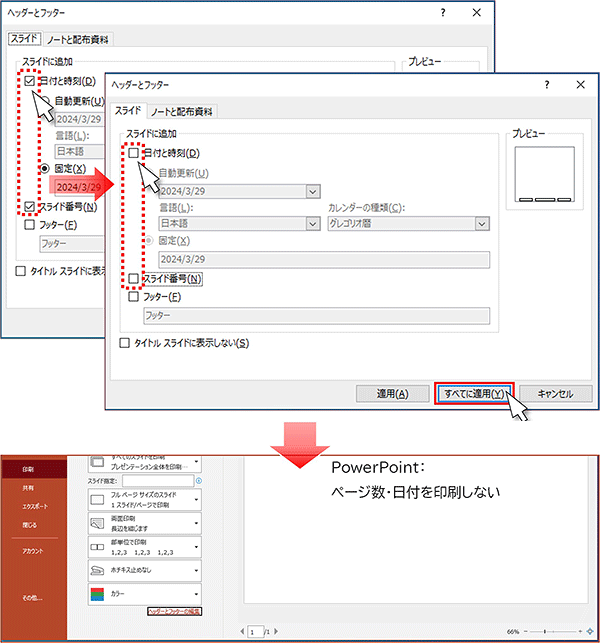 「ヘッダーとフッター」画面の「スライド」タブを選択し、「日付と時刻」「スライド番号」部分のチェックを外し、「すべてに適用」ボタンをクリックします。
