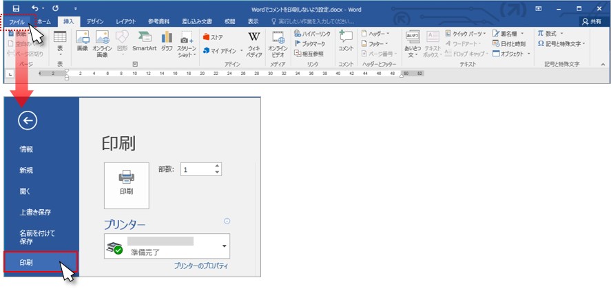 「ファイル」タブを選択し、表示されたメニューから「印刷」をクリックします。