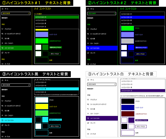 【補足】【ハイ コントラスト】[テーマの選択]から選ぶ4つの色の組み合わせ