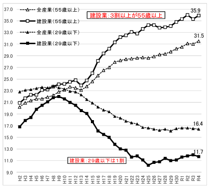 また、高齢化の進行も他の産業と比べて顕著に進んでいます。55歳以上の就業者が全産業で31.5%、建設業は35.9%と高齢化者の割合が多いだけでなく、29歳以下の割合は全産業で16.4%、建設業は11.7%と若者の割合が少なく、若者に人気がない業種あることが確認でき次世代への技術継承が大きな課題にもなっています。