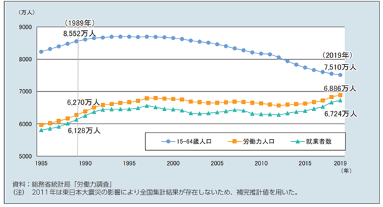 原因の一つと考えられるのが少子高齢化です。少子高齢化により、いわゆる生産年齢人口(15~64歳)が1985年以降減少を続けています。経済活動が縮小しない限り絶対的に働き手が不足する状況にあり、企業の人員確保は年々厳しさを増していくことが予想されます。