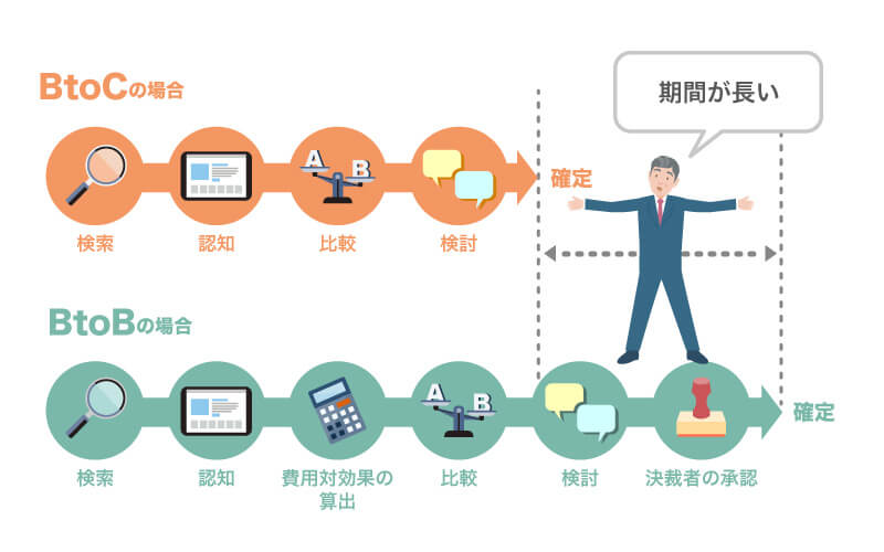 これまでちゃんと考えてみたことはなかったけど、一般消費者向けのビジネスに比べて、法人向けのBtoBビジネスは実際に買ってもらえるまでの検討期間が長いのが特徴なんだな。うん、これは確かにそうだ。自分がモノを買う時は一人で決めるか、奥さんに相談する(お許しを得る??)ぐらいだけど、法人の場合はやれ費用対効果の算出だ、やれ社内の協議だと、最終的な決裁者に承認してもらうためのフローっていうのがあって、たとえ「いいね!」と思ってもらっても担当者の一存では決められないことが多い。私たちも、商談が熟成するまでこれまで何度足繁く通ってきたことか・・・。よし、お客さまへの訪問が無くなったぶん、その時間を使ってデジタル技術を活用した商談の流れを一からじっくり習得してみよう。