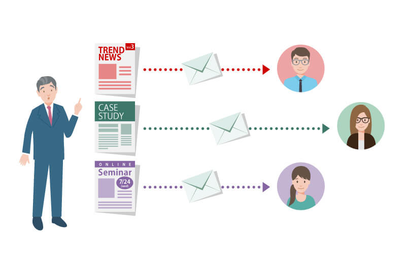 そんなわけで、じゃあ次は会ったこともない見込み客の皆さんにうちの製品のことをより理解してもらい、購入時期を逃さない方法を学んでいこう。取得した情報を活用し、定期的に接触を図って、見込み客を育てる。それには、メールの利用が効果的らしい(そして、こういうのを「メールマーケティング」と言うらしい!)。うん、そういえば、私のPCにも登録した企業やメディアから毎日たくさんのメールが届く。関係ないと思うものはすぐ削除してしまうが、中には有用な情報もある。コロナ禍、コロナ後、テレワークの定着を見越して、うちも定期的なメール配信をしてみよう。まず、業界のトレンド情報はほしいだろう。導入事例や成功体験も興味を持ってもらえるかな。オンラインセミナーもいいだろう。とにかく興味を持ち続けてもらえる情報を配信することが大事だな。