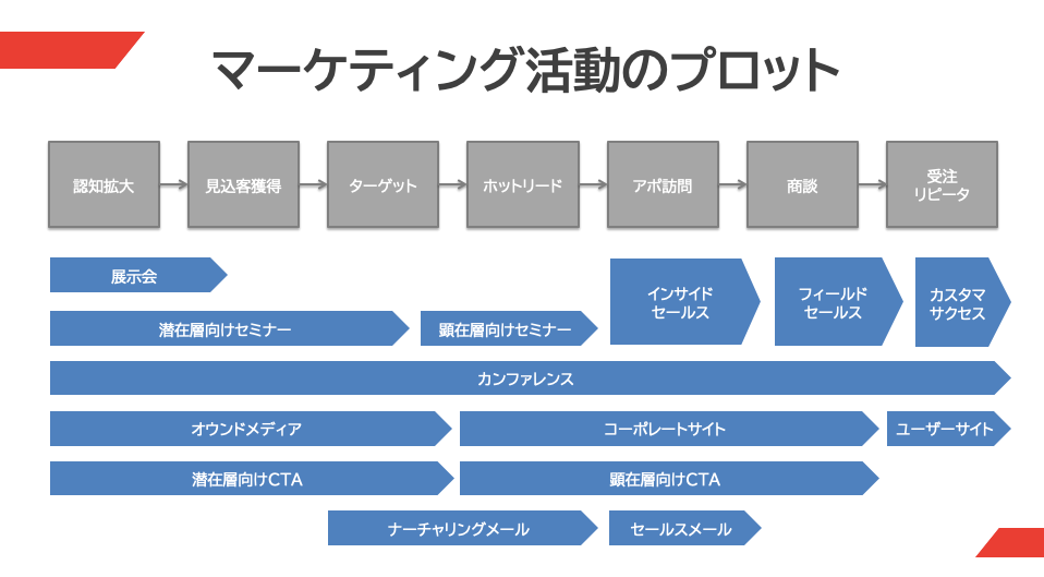 垣内「100%の正解はないですが、確度を高めることはできますし、高めないと損をしてしまいます。基本ですが、ターゲットとペルソナをしっかりと設定して、カスタマージャーニを描く。ここを飛ばす企業、もしくは浅い企業が多いですが、議論をして決めていき、上層部にも理解していく必要があるフェーズです。リードのステージに合わせたマーケティング接点を設置することでレスポンスを上げ、連鎖させるように売上に貢献していくような設計が必要となります。
