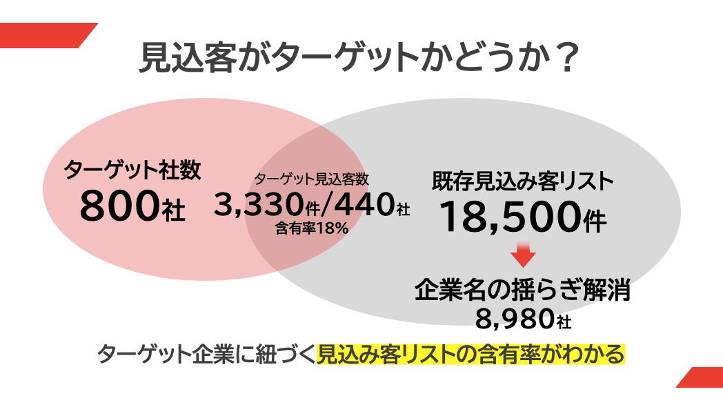 垣内「アカウントベースのデータクレンジングとは、データベースにある重複や誤記、表記揺れをなくすことで、企業情報を一意にする作業です。BtoB営業をしていくうえで必要な作業です。データベースで企業に寄せていく作業をすると、必ず社名揺れが発生しています。前株なのか後株なのか、社名変更や略式名称などなど。