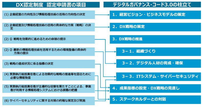 デジタルガバナンス・コードは以下の項目で構成されており、DX認定制度の申請にあたって記入する項目はすべてデジタルガバナンス・コードの項目と対応しています。
