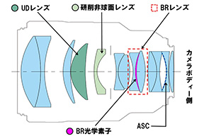 有機光学材料「BR(Blue Spectrum Refractive)光学素子」を凹凸のガラスレンズで挟み合わせたキヤノン独自の複合レンズ。