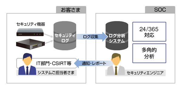 今回提供するSOCサービスは、セキュアソフトのグループ会社であるサービス&セキュリティ株式会社(以下SSK)が運営しているセキュリティオペレーションセンターにおいてお客さまのセキュリティ機器(ファイアウォール、IPS、UTM、WAFなど)のセキュリティログを24時間365日体制で監視・分析し、インシデントの検知と通知を行い、セキュリティエンジニアによる分析結果を月次レポートとして提供します。また、アドバンスサービスとして、キヤノンMJグループのセキュリティエンジニアによる通知情報の詳細分析やインシデント発生時の対処方法アドバイスなどのサービスを提供することにより、お客さまのセキュリティ対策を支援します。