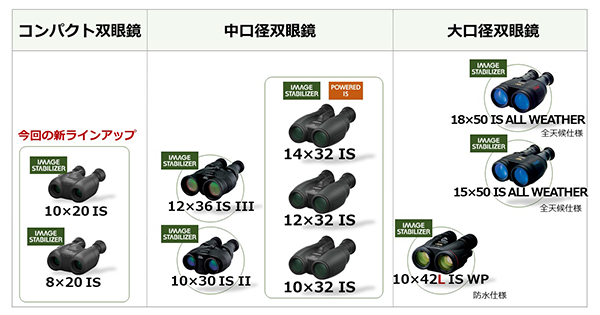 さらに、2017年11月には、手ブレ補正機能を強化した中口径の双眼鏡「10×32 IS ⁄ 12×32 IS ⁄ 14×32 IS」を発売し、12年ぶりにラインアップを拡充。今回、小型・軽量の"8×20 IS ⁄ 10×20 IS"の2機種を追加し、「手ブレ補正機能付き双眼鏡」のラインアップは全10機種となります。
