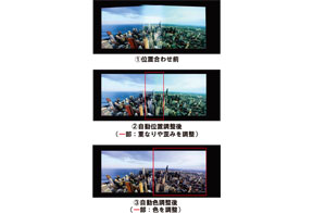 最大4台のプロジェクターがスクリーンに投写する映像を、市販のレンズ交換式カメラ「EOS Kiss」と交換レンズ※1を用いて撮影することで、位置ずれを自動調整する「自動位置調整機能※2」や、色や明るさを自動調整する「自動色調整機能」を利用することができます※3。