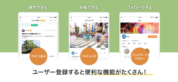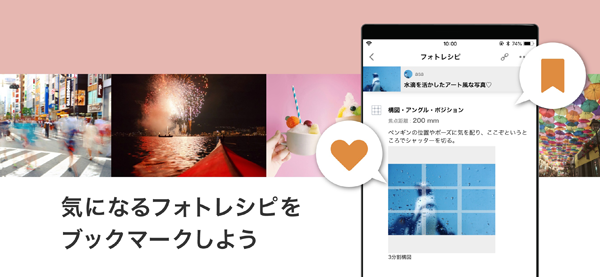 共有したい写真とその撮影コンセプトや使用した機材、撮影時の設定、撮影後の編集方法といった撮影に関連する情報を掲載する「フォトレシピ」をコミュニティーサービス上に投稿することができます。また、「フォトQ&A」では写真撮影に関する疑問や要望をコミュニティー内のユーザーに相談することができるなど、ユーザー同士が投稿し合うことで、新しい「撮り方」の気付きを得ることができます。さらに、画像認識AIを用いた「タグ付け」やユーザーがお気に入り登録した「フォトレシピ」や「フォトQ&A」を一覧表示する「ブックマーク」などの機能により、参考にしたい「撮り方」を簡単に閲覧することができます。