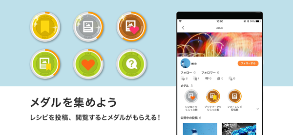 「フォトレシピ」・「フォトQ&A」の投稿数、閲覧数、お気に入り、いいねの数、フォロー数に応じてさまざまなメダルを獲得できます。