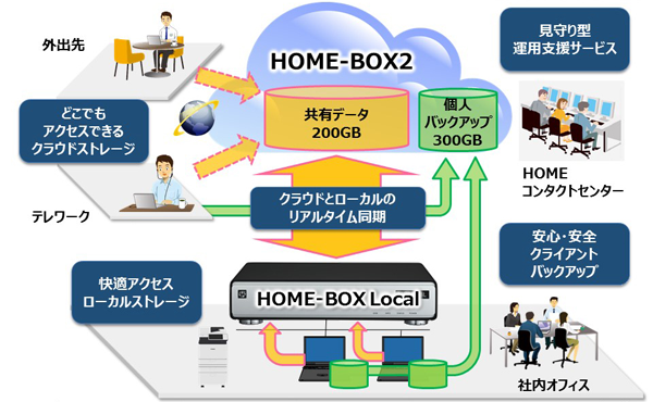 データはリアルタイムで同期され、外出先やリモートワークでも社内とのタイムラグのないデータ共有を実現しています。クラウド上の共有データは複製保管されると同時に、社内外問わずWindows PCのバックアップも3世代分自動取得されるため、BCPやランサムウエア対策にも有効です。運用面では「HOMEコンタクトセンター」がHOME-BOX LocalのCPU ⁄ SSDの稼働状況やHOME-BOX2との連携をリアルタイムで監視し故障やその予兆も迅速に対応します。また、ランサムウエア感染等でデータの復旧が必要となった場合のリカバリー支援など、充実の見守り型支援サービスを提供します。