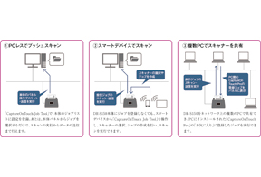 無線LAN・有線LAN・USB の3 種類のインターフェースに対応し、多様なオフィス環境において、自由なレイアウトでスキャナーの共有・活用が可能です。 専用アプリケーションと連携することで、(1)「PC レスでプッシュスキャン」、(2)「スマートデバイスでスキャン」、(3)「複数PC でスキャナーを共有」を実現します。