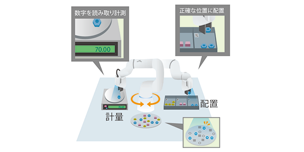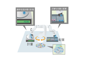 "Vision Edition-C"の形状マッチング機能により、複数種類の形状の部品を判別し、種類別に正しく配置したり、数字の読み取り機能により、計測器のデジタル数値から重量確認を行ったりするなどの作業も可能。