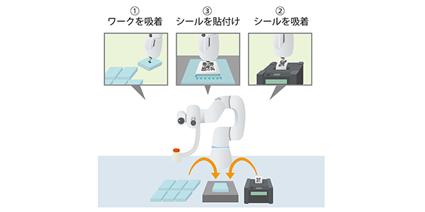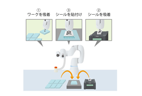 「COBOTTA」で対象物にシールを貼る工程において、"Vision Edition-C"を活用。画像処理により、ピック&プレイス作業時の位置補正ができるため、対象物を置く位置がずれた場合にも、適切な位置にシールを貼り付けたり、貼り付けた後にシール位置検査を行ったりすることが可能。これまで人が行っていた単純作業の自動化に貢献。