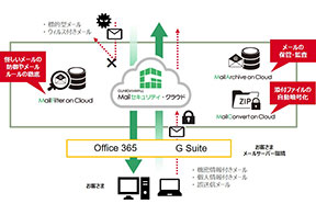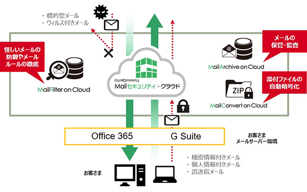 "GUARDIANWALL Mailセキュリティ・クラウド"は、企業の導入が進むOffice 365やG Suiteといったクラウドメールの標準機能だけでは対応できない情報漏えい対策を実現するクラウドサービスです。国産開発体制の強みを生かした高度な日本語フィルタリングを可能とする「MailFilter」、添付ファイルのZIP暗号化や宛先のBcc変換などを自動で行う「MailConvert」、メール保管と柔軟な検索で監査や調査を容易にする「MailArchive」をラインアップし、あらゆる側面からメールでの情報漏えいを防ぎます。