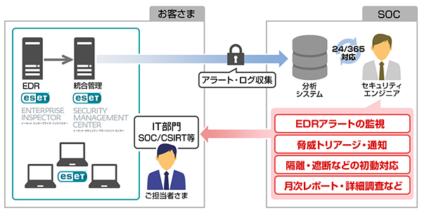 キヤノンMJは、ITセキュリティに特化したコンサルティングや脆弱性診断などのサービスを展開する株式会社ブロードバンドセキュリティ(代表取締役社長:持塚朗、以下BBSec)との協業により、高い検出力と低い誤検知率を誇るESET社のEDR製品「ESET Enterprise Inspector、以下EEI」の運用監視サービスを年額2,300円※4から利用できる"EDR運用監視サービス"を提供します。本サービスは、BBSecのSOC(Security Operation Center)から、お客さまのEEIを専門のセキュリティエンジニアが24時間365日体制で監視し、EEIが発するアラートを監視・分析して危険度に応じて状況を通知します。また、インシデントが発生した場合でも侵害端末のネットワーク隔離や不正なプロセスの強制停止、侵害状況の調査報告※5などの初動対応を行い、被害の最小化を支援します。お客さまはシステムや業務の復旧やステークホルダーへの情報公開、再発防止策の検討など、より重要な対応に専念できます。